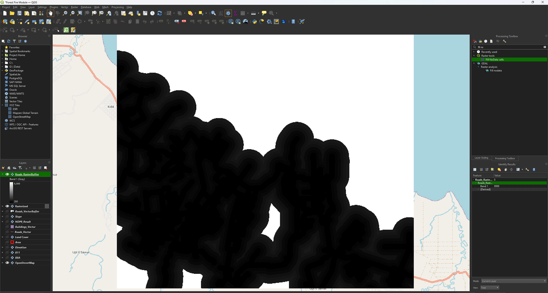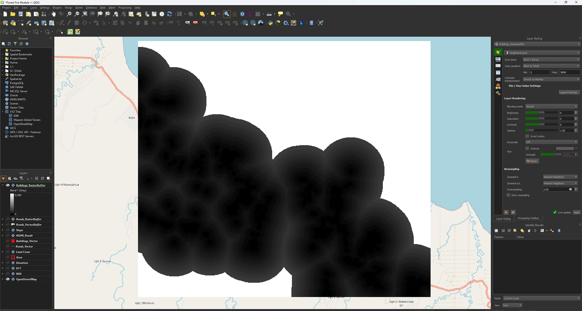 We get a result that looks a bit different from the clean buffers we created for the Roads layer. However, if you click around with the Identify Features, you can see that the values are nicely between 0 and 2400. Everything further than 2400 meters gets a value of 9999. For now, we are finished with this layer. In 4.4 Roads and Buildings, we will Reclassify the layers, which will neatly categorise everything back into ringed buffers.