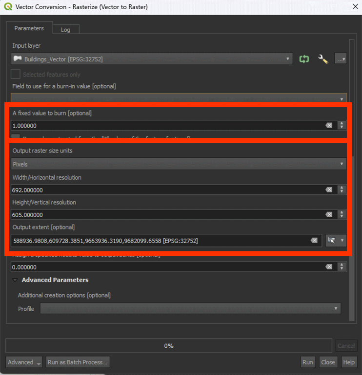 In the Vector Conversion window, you'll need to enter values for width and height. So, before we continue, it's important to use the same values from the other layers. This ensures that the pixel size and extent of the raster match exactly. Luckily, we used an Area polygon to cut them to the same size.