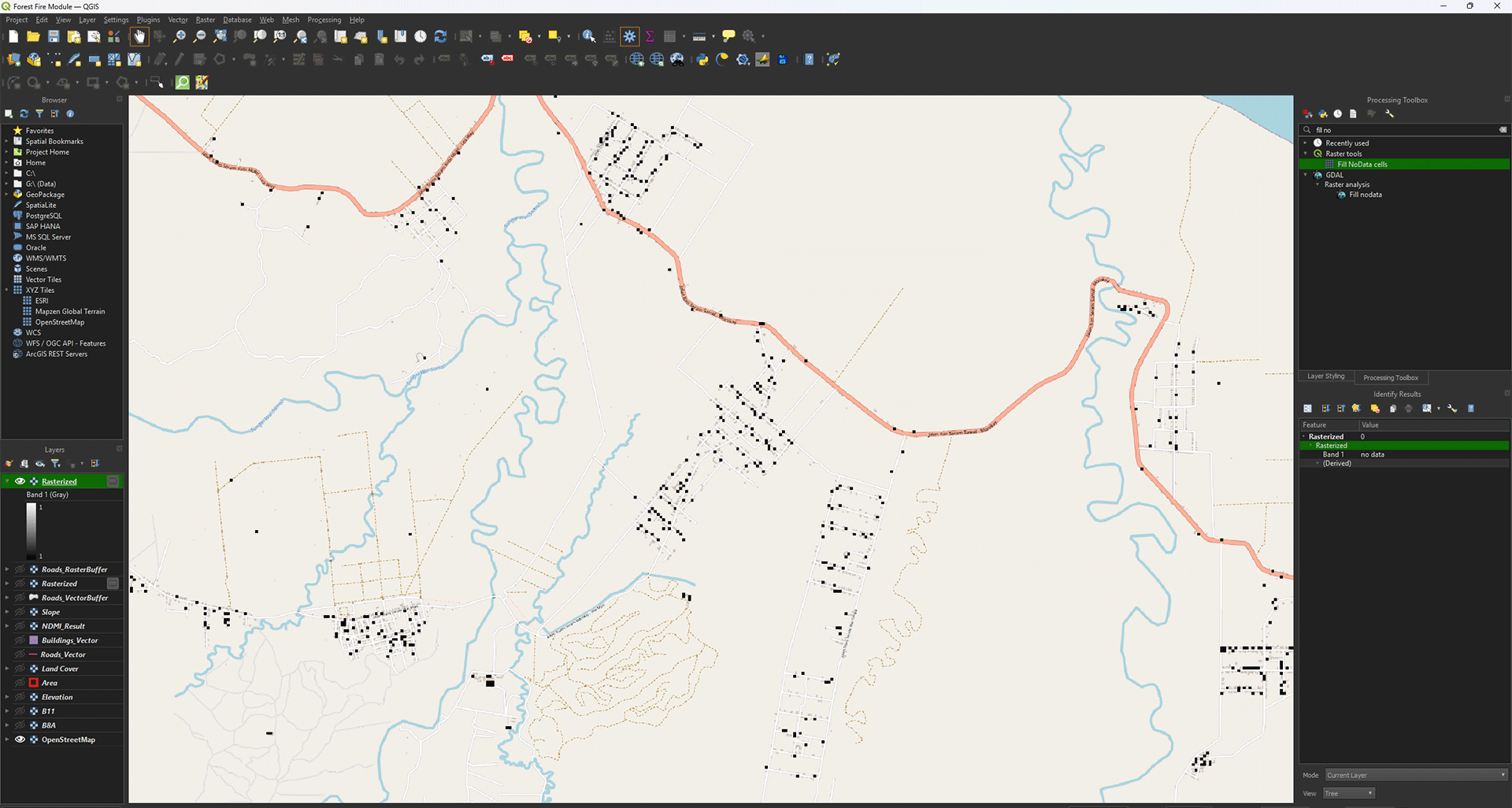10. Open the Processing Toolbox and search for the Fill Nodata cells tool we used earlier. Make sure the Rasterized layer is used as the Input.