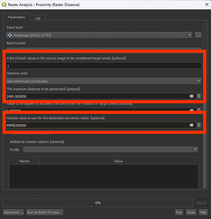 12. Set Nodata value to use for the destination proximity raster to 9999. Everything past the 2400 meters will get a 9999 value.