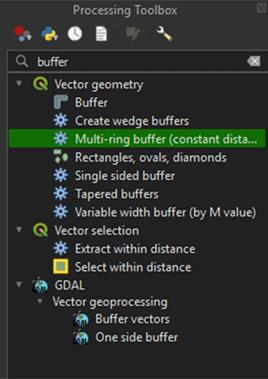 1. Go to the Processing Toolbox and search for Multi-ring buffer (constant distance) under Vector geometry. Double click to open the tool.