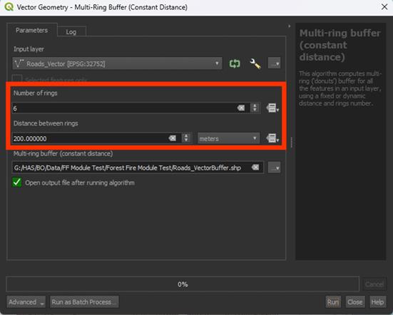 4. Under Distance between rings, set it on 200 meters. The tool will create 6 rings that are all 200 meters wide. As we chose 6 rings, we get a buffer of 1200 meters.
