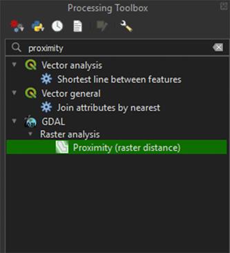 7. Go to the Processing Toolbox and search for Proximity (raster distance) under GDAL > Raster analysis. Double click to open the tool.