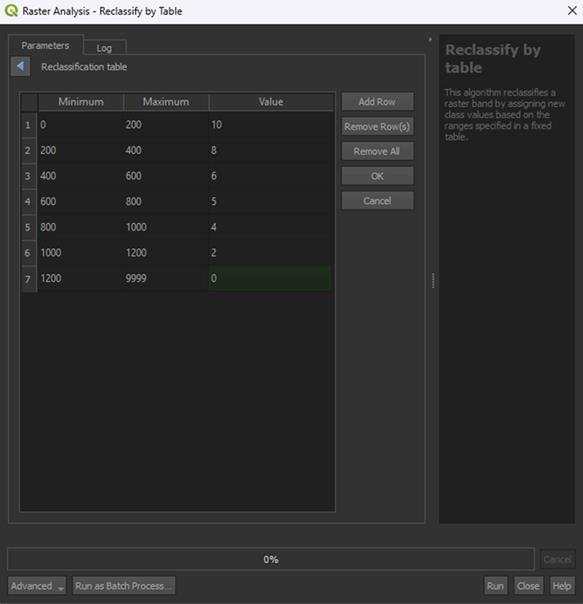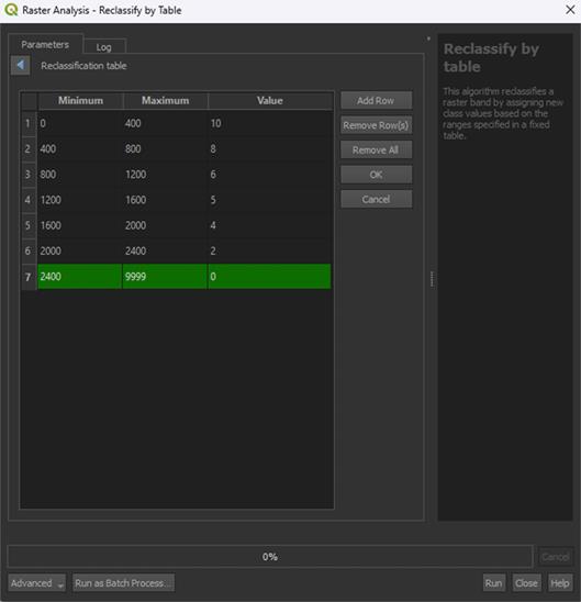 1. Open the Reclassify by table tool again and make sure the Roads_RasterBuffer layer is selected.