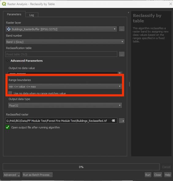 5. Set the Range boundaries on min <= value <= max. This is only to get rid of the building pixels, which would get a value of 0. It doesn’t matter too much, but it is a bit messy.