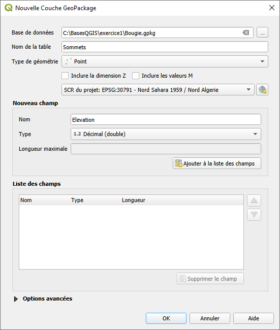 Pour le nom de la table, nous choisissons Sommets. Pour Le type de géométrie que nous choisissons « Point ».