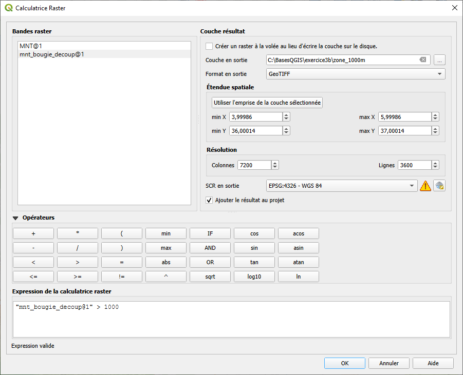 2. Dans la boite du dialogue double cliquez sur MNT_bougie@1 et dans la case Expression de la calculatrice raster, complétez l’expression pour avoir « "MNT_bougie@1" > 1000 ».