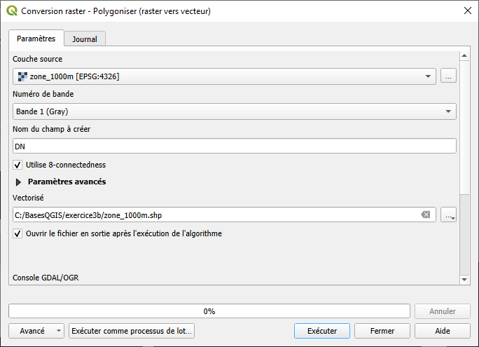1. Remplissez la boite de dialogue tel que dans la figure suivante, Cochez sur 8-connectedness et nommer le fichier de sortie « zone_1000m». Cliquez sur Exécuter et puis Fermer.