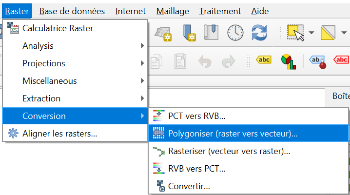 2. Dans la barre du menu cliquez sur Raster 🡺 Conversion 🡺 Polygoniser (Raster vers Vecteur…)