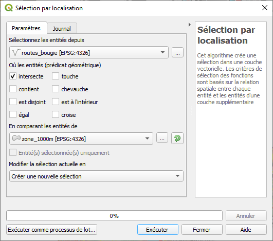 2. Remplissez la boite de dialogue comme suit. Assurez-vous que « intersecte » est coché. Cette opération va sélectionner automatiquement toute route qui intersecte avec la zone annuellement enneigée. Cliquez sur Exécuter puis Fermer