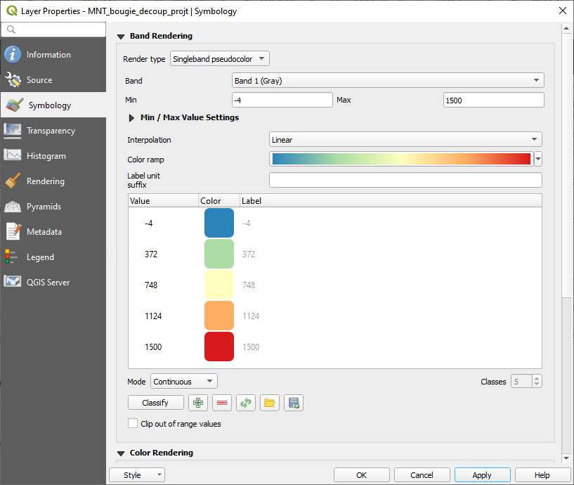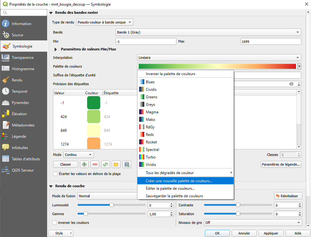 4. Pour la couche mnt_bougie aller vers les propriétés 🡺 Style et Choisissez un type de rendu Pseudo_couleur à bande unique