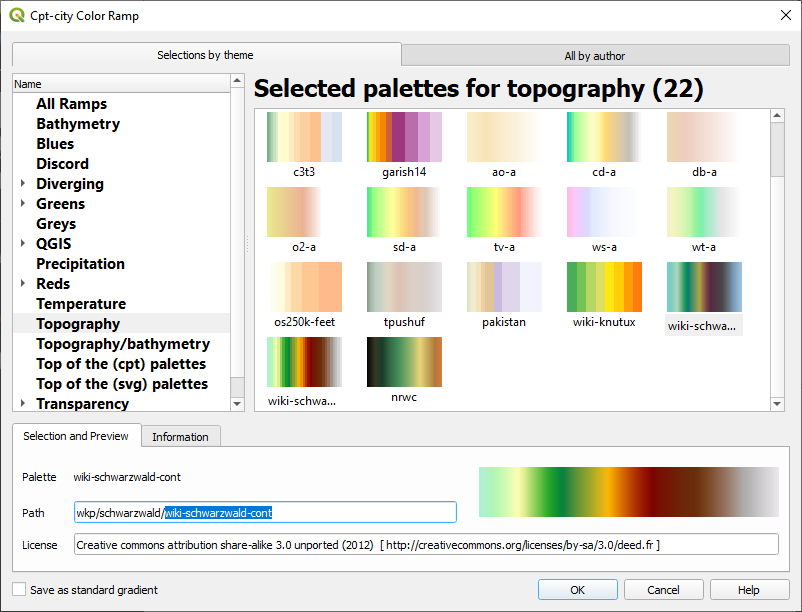 1. Si vous voulez avoir accès à des palettes de couleurs spécialisées. Allez dans Couleur 🡺 Nouvelle Rampe de couleur 🡺 cpt-city. OK. Ce sont des palettes de couleur conçues pour les différents objectifs de visualisation graduée.