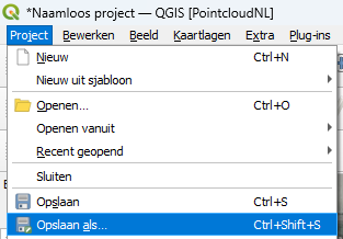 6. Ga in het hoofdmenu naar Project | Opslaan als... en sla het project op in hetzelfde mapje als de LAZ files. Kies een naam, bijvoorbeeld DenBosch.qgz.