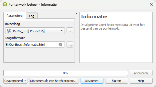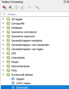 2. Klap in het Toolbox Processing paneel Puntenwolk beheer uit door op de pijl te klikken en dubbelklik vervolgens op de Informatie tool.