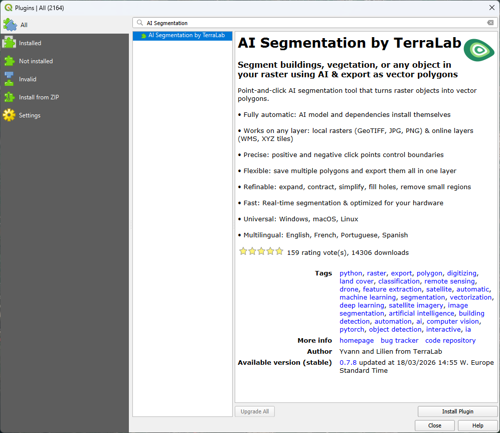 - Search for AI Segmentation by Terralab and click Install Plugin.