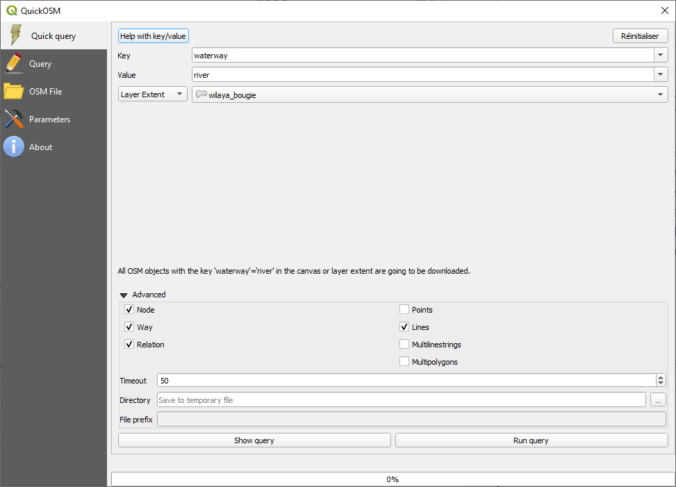 Choisissez « waterway » comme clé (key), et comme valeur « river ». Choisissez le polygone wilaya_bougie comme étendue de la couche. Cliquez sur la flèche devant Avancé et assurez-vous que seuls Node, Way, Relation et Lines sont cochés. Le dialogue devrait maintenant ressembler à la capture d'écran ci-dessous. Cliquez sur Run Query (Exécuter la requête).