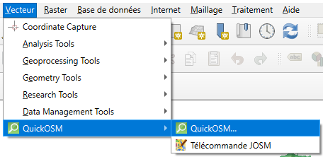 Ouvrez la boîte de dialogue QuickOSM en choisissant dans le menu principal: Vecteur 🡺 QuickOSM 🡺 QuickOSM