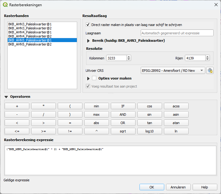5. Voer onder Rasterberekening expressie in: ("BKB_AHN5_Paleiskwartier@1" * 2) + "BKB_AHN3_Paleiskwartier@1"